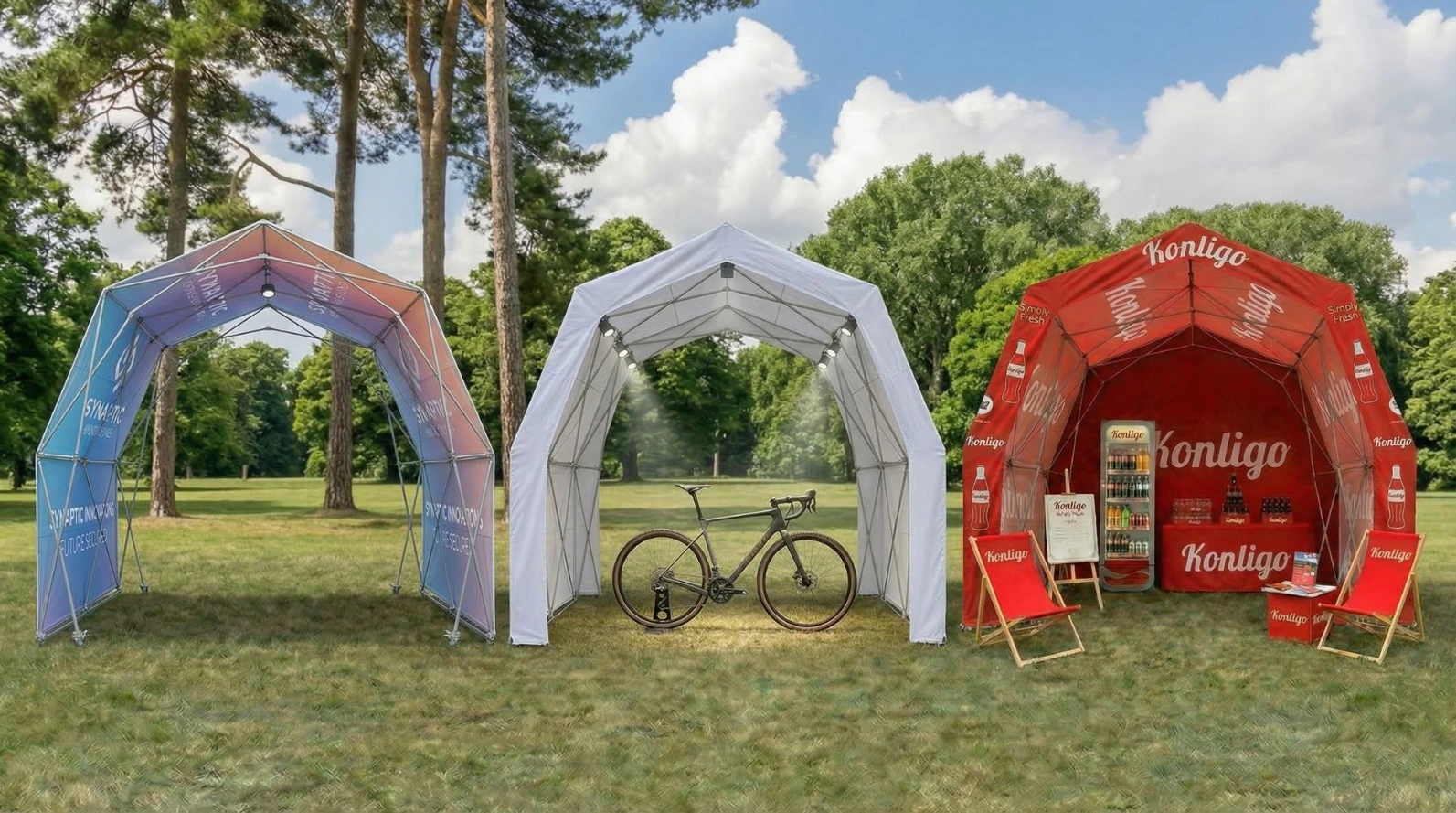 Konligo tents offer practical transport and quick assembly, and provide shaded areas with iconic visual presence, perfect for festivals, receptions and branded spaces.